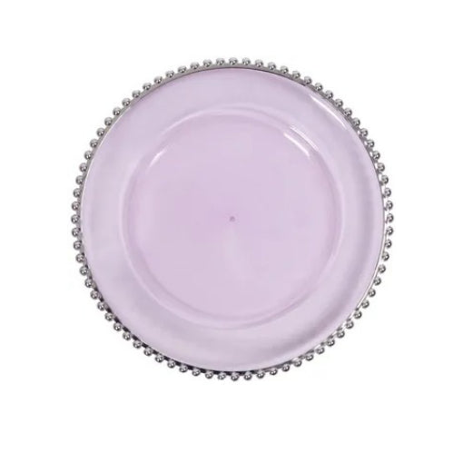 Dale un toque elegante y sofisticado a tu mesa con este plato base de color lila transparente con un borde plateado con perlas. Esta pieza única se convertirá en el centro de atención de la mesa y agregará un toque de glamour a tu decoración.
